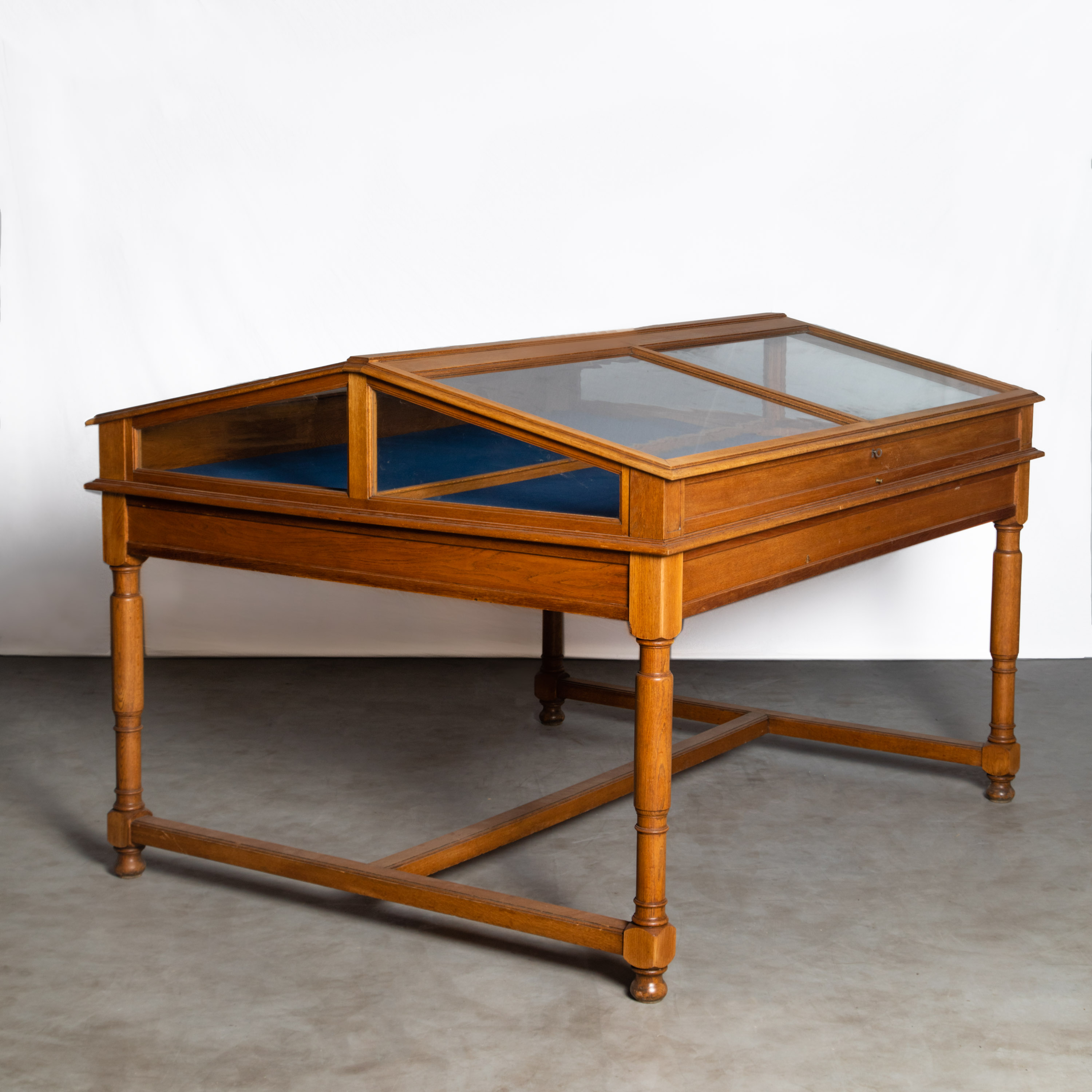 antieke mahoniehouten en schellak tafelvitrine uit 1905, uit het Muiderslot. onderstel 82Hx62x62, kastje 100Hx65x65. Interieur 95x57x57. Glazen plafond.